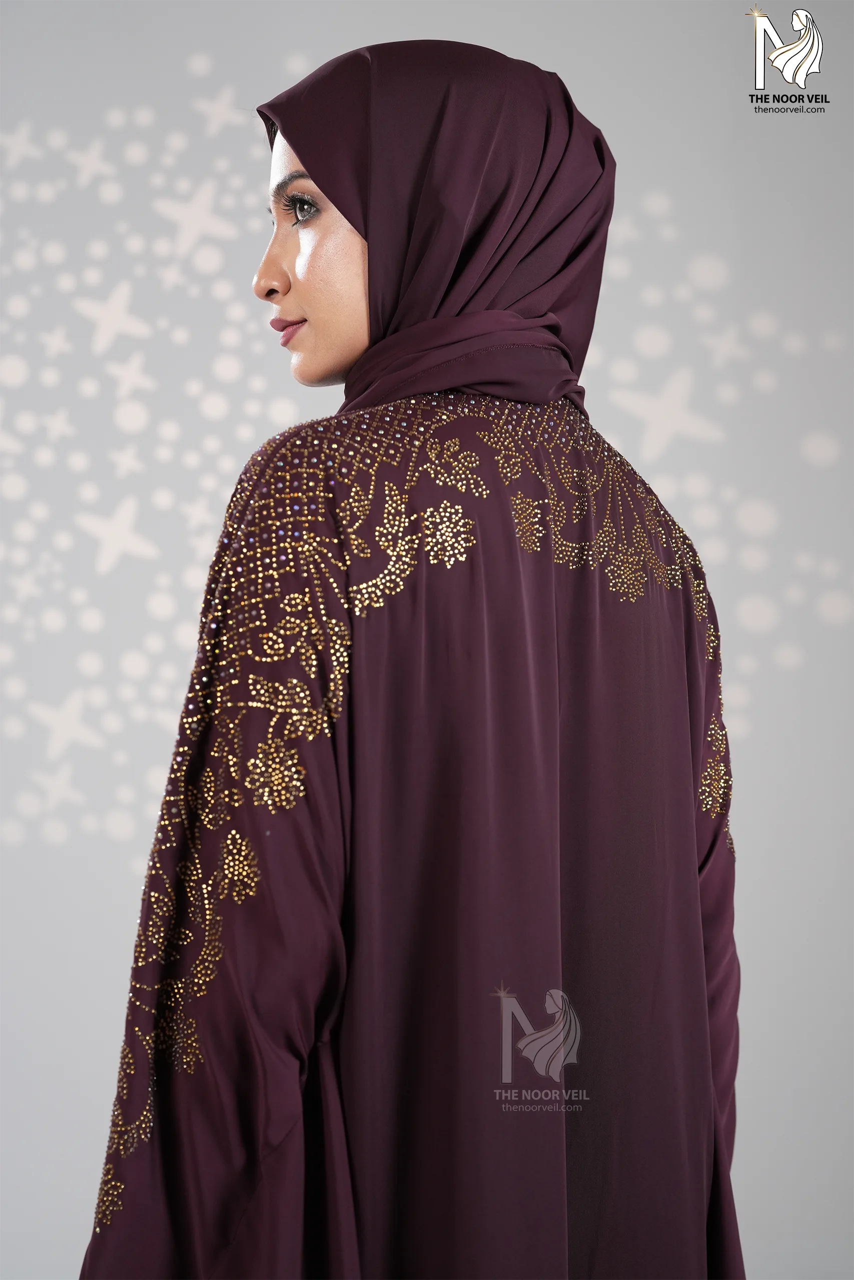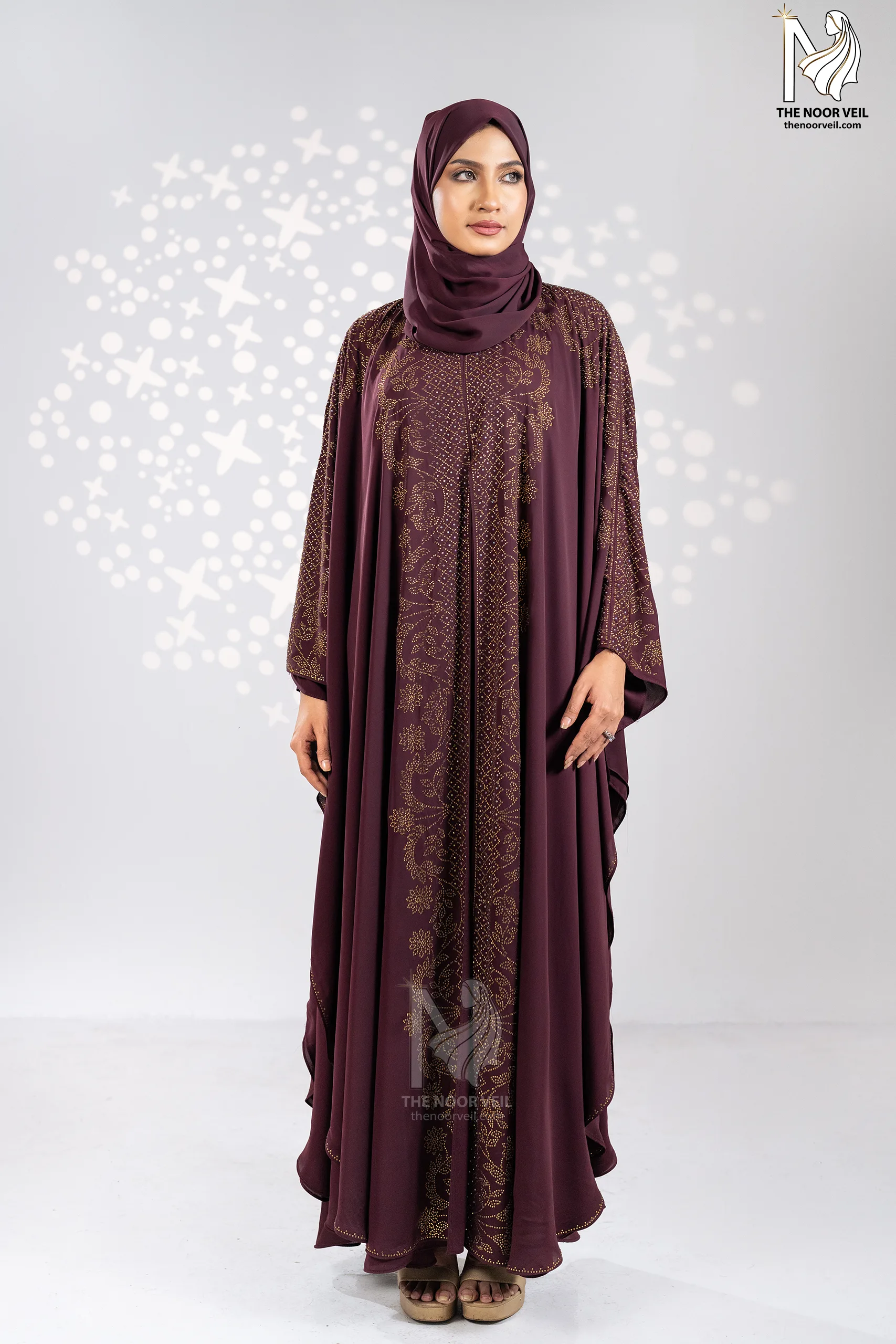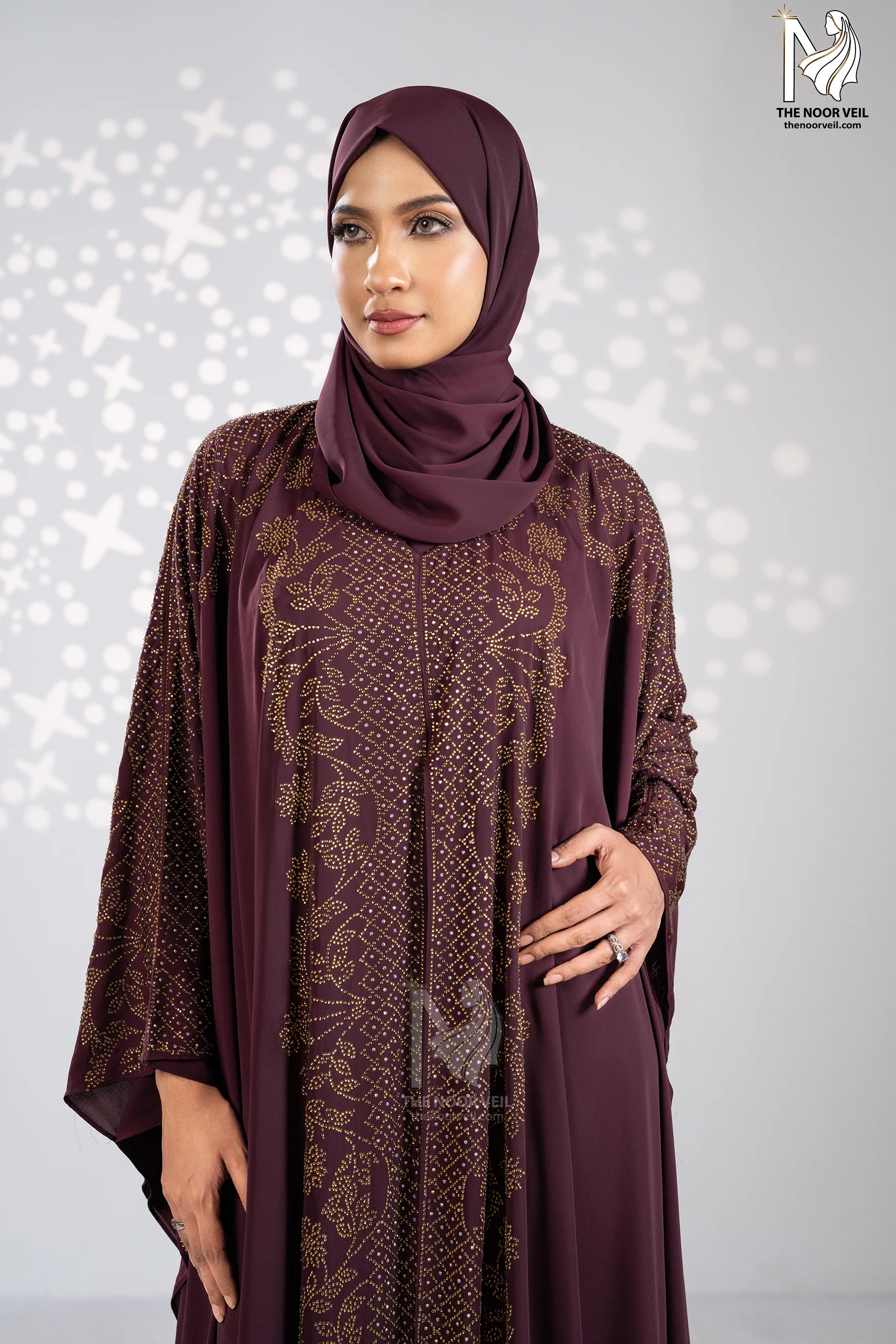 আমাদের প্রিমিয়াম কালেকশনের বিশেষ সংযোজন “মাহনূর আবায়া (Mahnoor Abaya)” আপনাদের জন্য নিয়ে এলো গভীর মেরুন(Deep Maroon) রঙের আভিজাত্য ও সোনালী কাজের জৌলুস। চাঁদের আলোর মতো স্নিগ্ধ এই আবায়াটি তাদের জন্য সেরা পছন্দ যারা মডেস্ট ফ্যাশনে রাজকীয় ছোঁয়া রাখতে চান।