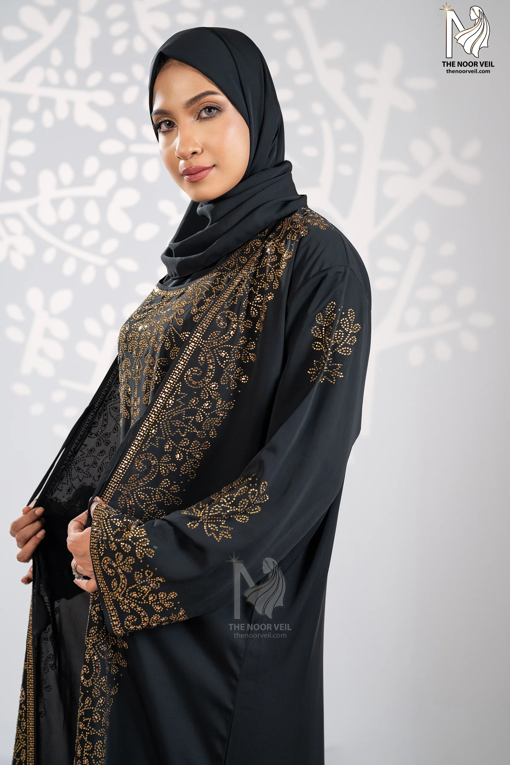 ১. লম্বালম্বি স্টোনের প্রিমিয়াম কারুকাজ: আবায়াটির সামনের মাঝখানের অংশে (Front Panel) এবং হাতার নিচের দিকে রয়েছে নিপুণভাবে বসানো DMC স্টোন ও লতাপাতা নকশার কাজ। এই লম্বালম্বি ডিজাইনটি আপনাকে দেখতে আরও লম্বা এবং স্লিম দেখাবে, যা যেকোনো অনুষ্ঠানে আপনাকে আত্মবিশ্বাসী করে তুলবে।