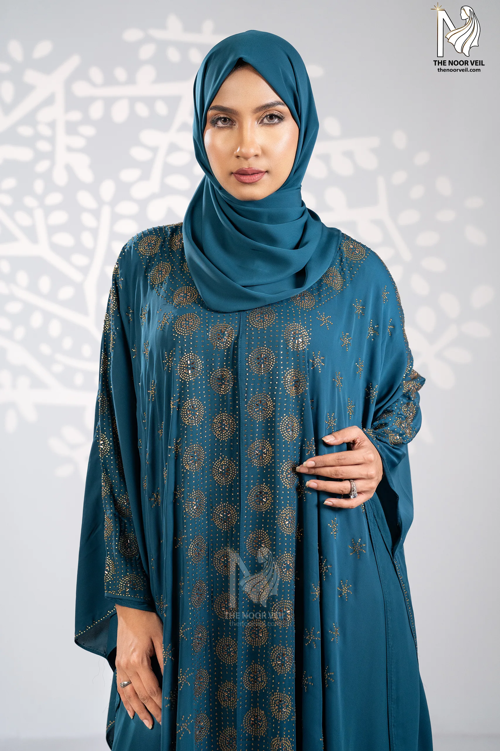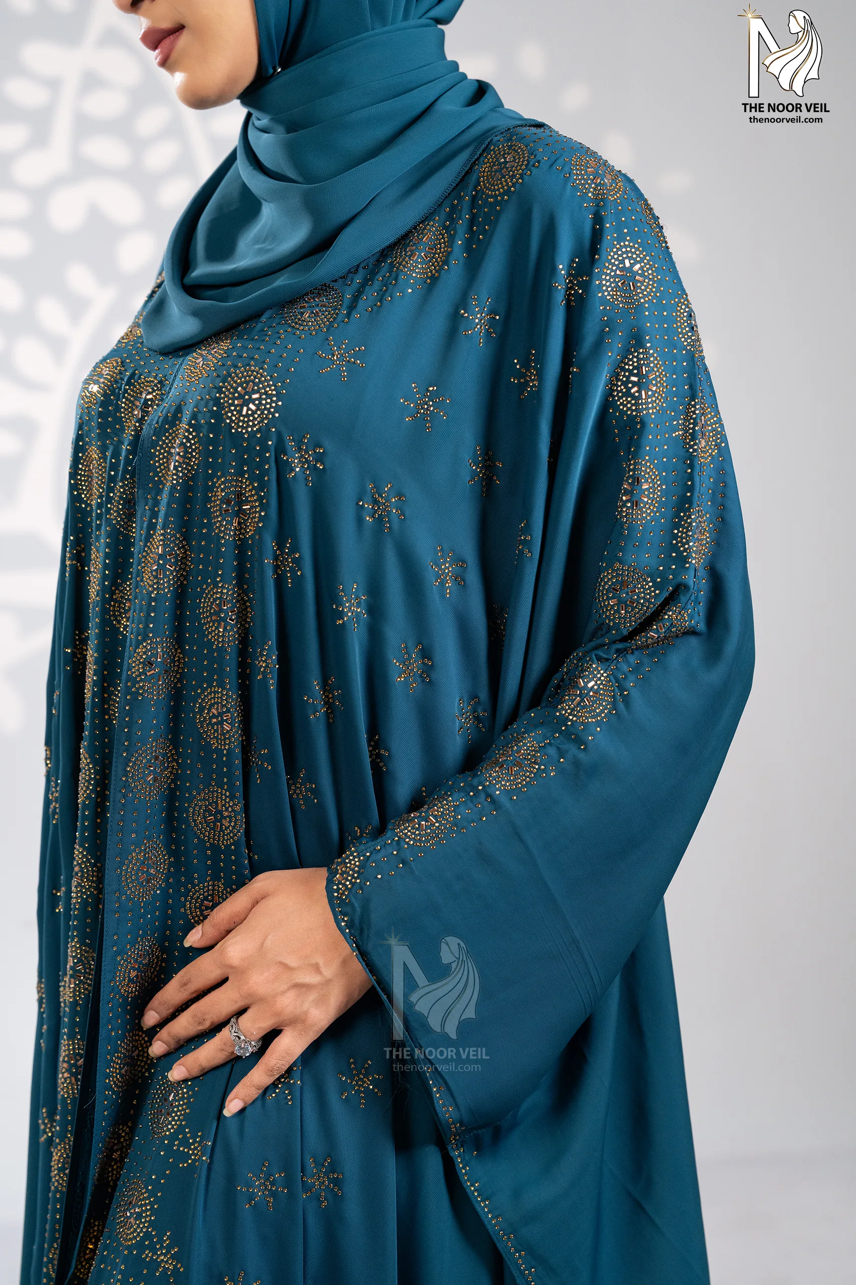 ১. সোনালী ম্যান্ডালার আভিজাত্য: আবায়াটির বডি এবং হাতায় রয়েছে নিখুঁতভাবে বসানো গোল্ডেন DMC স্টোনের ম্যান্ডালা এবং স্টার-বার্স্ট ডিজাইন। টরে রঙের ওপর এই উজ্জ্বল কারুকাজগুলো যেকোনো অনুষ্ঠানের জন্য আপনাকে করে তুলবে মার্জিত, শালীন ও আকর্ষণের কেন্দ্রবিন্দু।